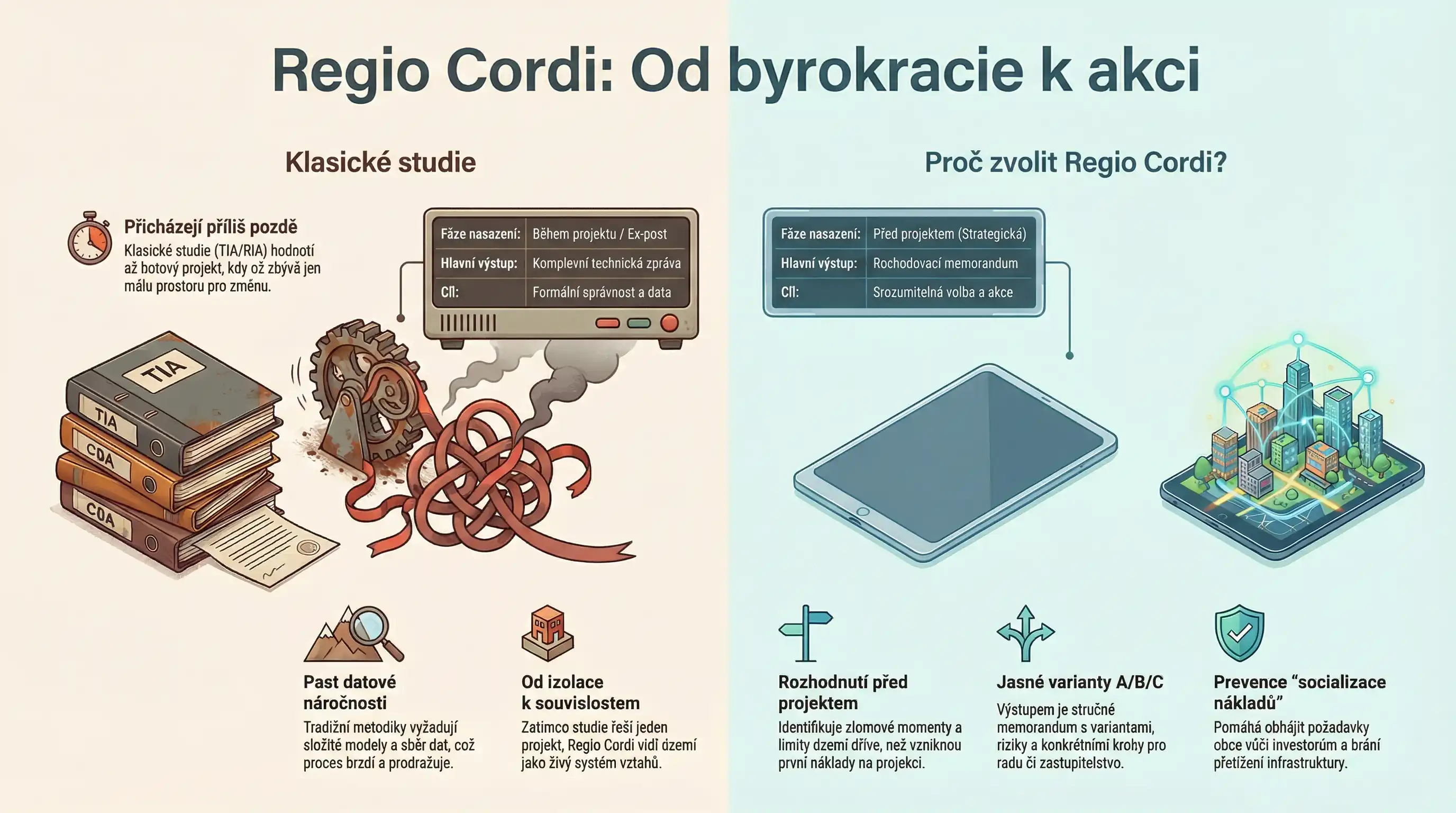 Práce s variantami je klíčem k politické stabilitě vedení obce. Regio Cordi transformuje urbanistická data do stručného Rozhodovacího memoranda, které obci poskytuje tři zásadní nástroje: