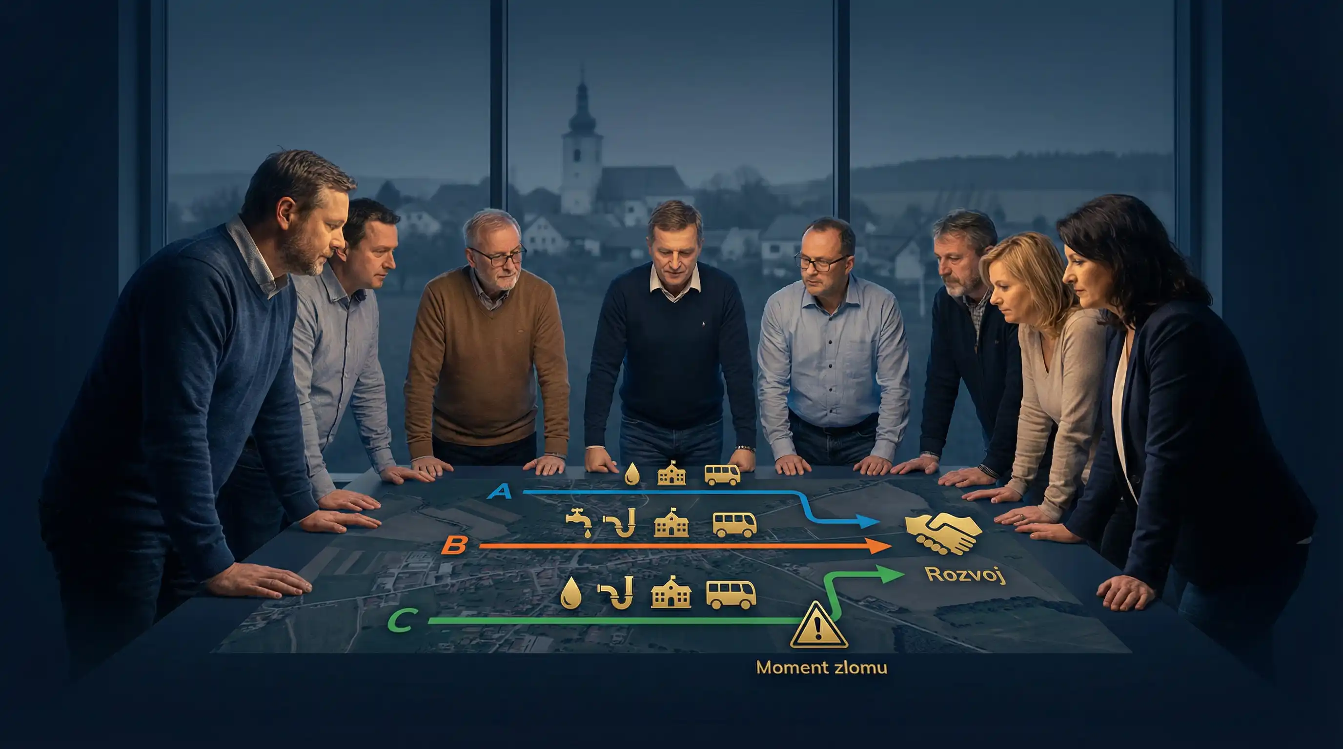 Samostatný rozhodovací proces: co je pro obec nejvhodnější. Ne „co by se líbilo“, ale 2–3 realistické scénáře s dopady na dopravu, sítě, školství, veřejný prostor, rozpočet a veřejnou přijatelnost. Cíl: dohoda, která přežije volby.